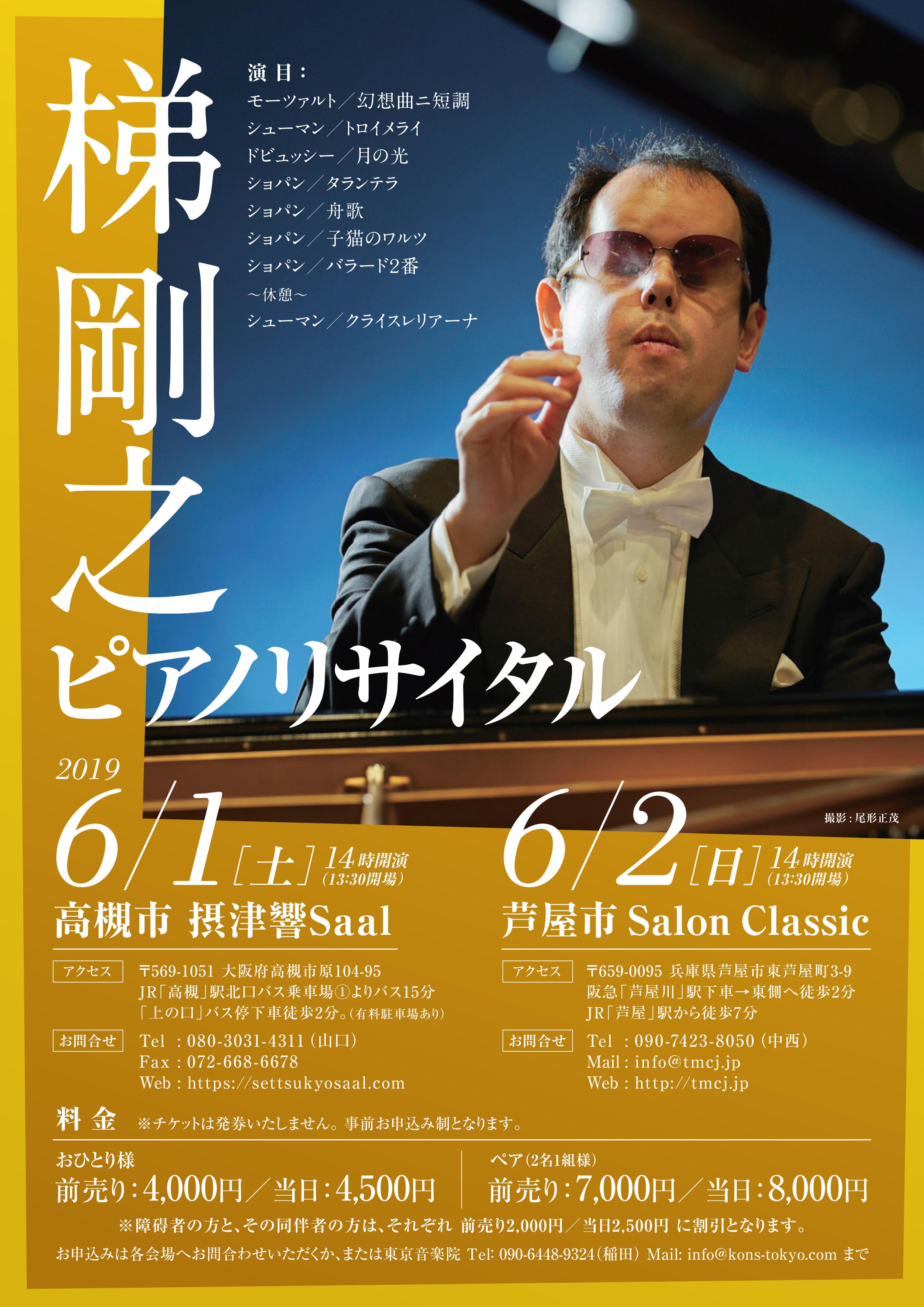 2019年6月1日、2日と二日間にわたり、高槻市(大阪)、芦屋市(兵庫県)にてソロリサイタルを行います。
